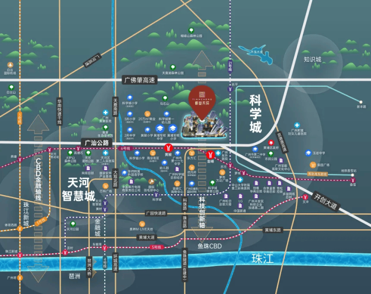 外部生态资源更是得天独厚。项目北靠六片山山脉,六片山森林覆盖率高,空气清新,负氧离子含量丰富,是广州知名的生态秘境。周边还环绕着天鹿湖森林公园、天河湿地公园等多个大型公园,日常休闲可以步行到附近的科学城体育公园,周末带上家人驱车前往天鹿湖森林公园露营、徒步,亲近自然,放松身心。这样的生态环境,对于注重生活品质和家人健康的购房者来说,简直是刚需配置。