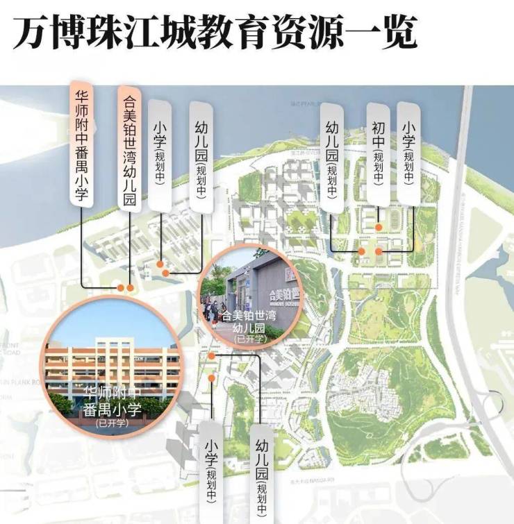 项目内规划有多所中小幼学校,其中包括华师附中番禺小学及公立合美铂世湾幼儿园(已开学),为业主子女提供了优质的教育资源。虽然初中部仍在建设中,但附近已有私立名校星执中学可供选择,未来教育配套将进一步完善。