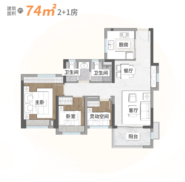 74㎡三房两卫:罕见小面积双卫配置,主卧双飘窗,5.3米景观阳台,南北对流;