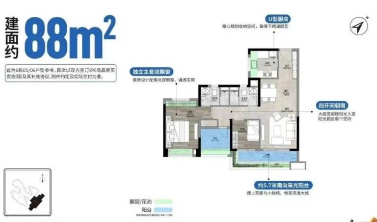 84–88㎡三房:5.5–5.7米南向大阳台,部分单位可望海景,四开间朝南提升采光;