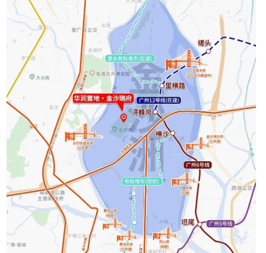 自驾出行方面,项目周边有金沙洲大桥、大坦沙大桥、在建的沉香大桥与同心桥、规划中的水道口大桥、黄岐大桥、丰岗大桥、碧江大桥环绕,形成完善交通路网,快速接驳广州主城与佛山,30 分钟内可达珠江新城、北京路等核心商圈,满足日常通勤与跨城出行需求。
