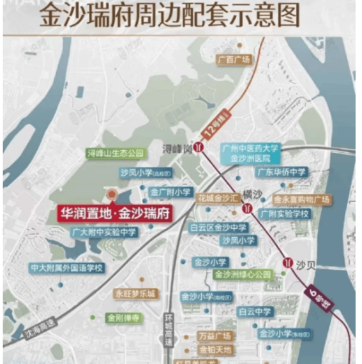 项目教育资源优质,对口小学为沙凤小学,周边 800 米左右有中山大学附属外国语学校幼儿园,满足学前与小学教育需求。更值得关注的是,金沙中学并入广附教育集团,引入广州白云广附实验学校先进办学理念,该校连续多年中考成绩名列前茅,师资力量雄厚、教学设施完善,为业主子女提供优质中学教育资源。此外,周边还有华南师范附小、广州华侨中学金沙校区、广附实验学校等学府环绕,形成全龄化教育体系。