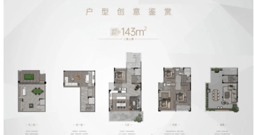 【17F 小高层洋房】143㎡四房两厅两卫,两梯两户布局,南北对流设计,通风采光极佳,客厅与餐厅一体化设计,拓展活动空间,次卧均带飘窗,提升空间利用率,适合三代同堂家庭。【4-6F 叠院】143㎡产品(含二叠上叠 / 下叠、三叠上叠 / 中叠 / 下叠),一梯一户设计,独门独户私密性强,部分叠院带庭院或露台,270° 环幕观景,可直观浔峰山与凤凰湖景观,叠墅空间分层设计,动静分区明确,满足高端改善群体对居住品质的极致追求。