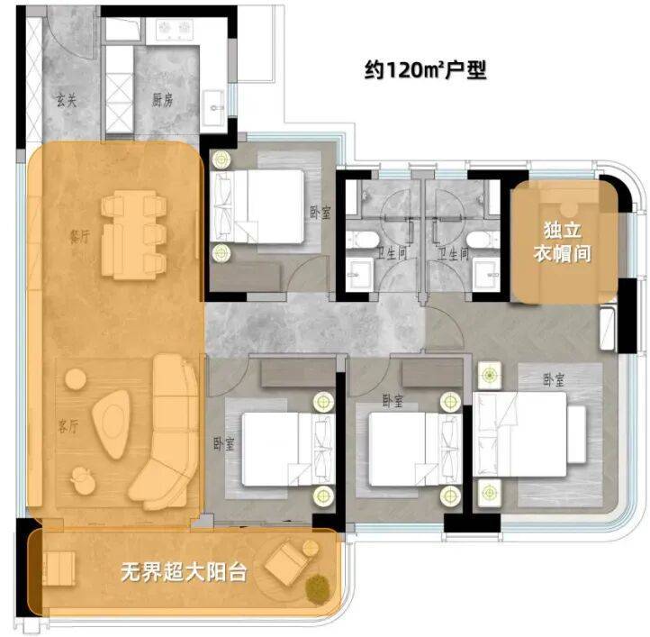 120㎡四房:总价约1140万元起,LDKB一体化设计,270°弧形落地窗,主卧套间带独立衣帽间,实际使用率105%。广州市住房和城乡建设局2025年9月《新建商品住宅面积测算技术规程》显示,该户型得房率超125%,远超周边竞品。