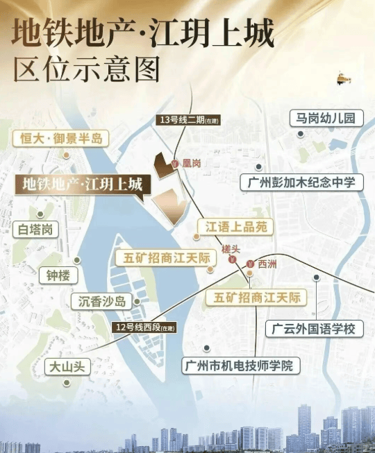 广州地铁地产精心打造的白云槎头TOD项目,正式命名为“地铁地产·江玥上城”。作为2025年广州城市发展的焦点之一,该项目位于珠江前航道西岸创新带的核心地带,处于政府规划中的“湾区新岸”——继珠江新城、琶洲、白鹅潭之后的珠江第四个“黄金十公里”。这个区域自2024年起便成为了广州迈向世界级滨水区的战略新核心,也是广州未来发展的重要关注点。江玥上城不仅占据了得天独厚的地理位置,更以独特的设计理念和高品质的生活体验,成为广州城市更新与发展的标志性项目。