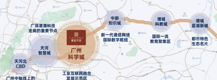 振业天成的区位优势十分突出,地处广州第三发展中轴线 “科技创新轴”,位于天河智慧城与黄埔科学城双城交汇之地。这条科技创新中轴以琶洲为核心,北起中新广州知识城,南抵广州大学城,汇聚金融总部、人工智能、数字经济、智能制造等核心产业,未来产业布局成熟后承载的 GDP 将超过 1 万亿元,成为广州经济发展的核心引擎。