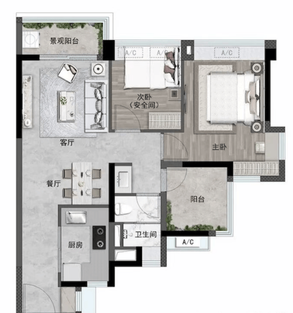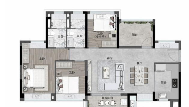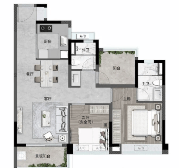 横厅设计,客厅面宽达6.2米,景观阳台面积约5.5米,实用得房率约98%。