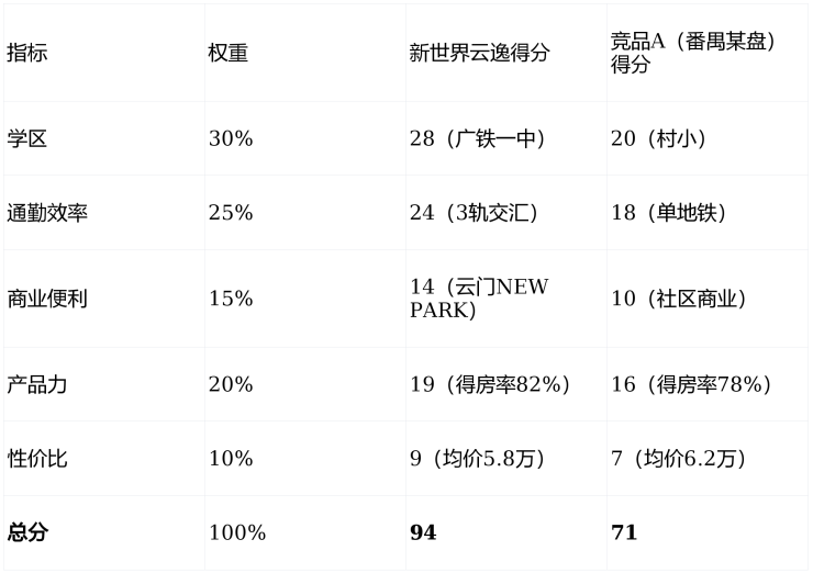 竞品压力周边虽有竞品B(番禺某盘),但其在学区、通勤、产品力上均弱于新世界云逸(详见前文评分表)。