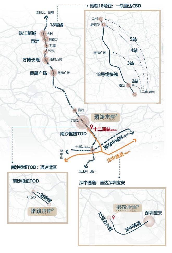 除了跨海大桥,项目的轨道交通前景同样令人期待。根据规划,广州地铁18号线南延段(至中山、珠海方向)的“十二涌站”距离项目约1.2公里。18号线作为目前国内时速最快的160公里/小时市域快线,其南延段将把珺筑水岸纳入湾区轨道快网。未来从此站出发,可快速接驳主线,实现快线5站直达珠江新城CBD,高效连接广州城市中心。这种“大桥+快线”的双重交通赋能,让项目兼具了面向深圳的“横向链接”与面向广州的“纵向贯通”能力,成为湾区西岸重要的交通节点之一。