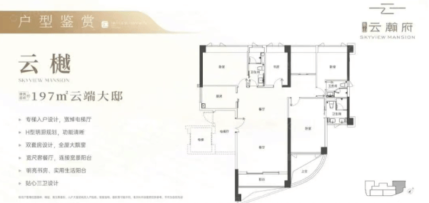 197㎡南向5房大平层:东向单边户,三套房配置,双阳台布局,尽享江景与城市天际线。