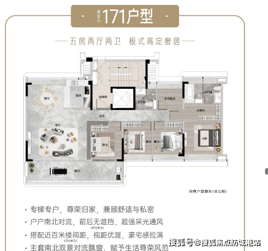 建面约171㎡奢适五房:低密8F小高层,仅少数人拥有,采用专梯入户设计,尊享私密空间,五房布局,可满足三代同堂其乐融融的居住需求,空间宽敞舒适,功能分区齐全,还能享长隆头排景观,彰显品质与格调。