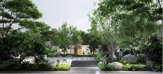 内部园林:35%绿化率,1.5万㎡中央园林,“莫奈花园”、“水月芳屿”等主题景观,保留百年榕树,打造“榕悦广场”与“榕舟剧场”。