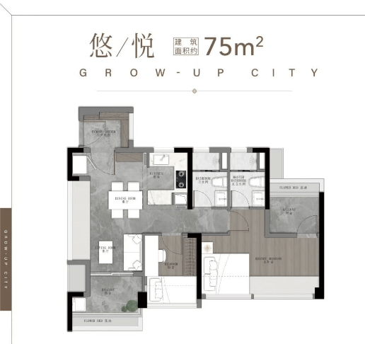 75㎡三房两厅两卫:年轻人主城上车首选,四开间朝南设计确保全明通透。全明转角玄关提升归家仪式感,开放式厨房拓展操作空间,开阔景观阳台连接客厅,让阳光与清风自由入户。南北对流的主套配备独立卫浴与衣帽间,兼顾私密性与舒适度,适配新婚夫妻或年轻家庭的居住需求。