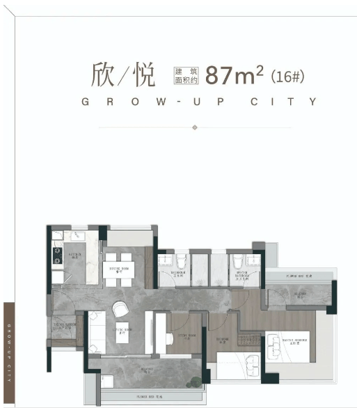 86㎡三房两厅两卫:一期断货王升级款,南向四开间设计带来约11.1米超大采光面。双进私密玄关保障居家隐私,5.4米跑道式阳台连接客厅与次卧,兼具观景与实用功能。主卧配备270°无立柱景观飘窗,推窗即可欣赏社区园林景致,阳光衣帽间与独立卫浴的配置,尽显生活尊崇,是三口之家的理想之选。