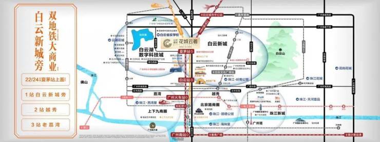 花城云著最大优势之一就是区位交通极其便捷。项目正上盖约20米处设置地铁22号线与24号线夏茅站,形成真正意义上的双地铁枢纽。乘坐22号线北延段,一站即可到达白云棠溪,换乘极为便捷;两站至越秀广州火车站,三站即可抵达老荔湾区,还能换乘5号线直达珠江新城。24号线则覆盖白云、越秀主要轨道节点,串联广州北站与棠溪核心 TOD 区。这样的线路布控,使得广州南北主干、东西联系都获得极大支撑。
