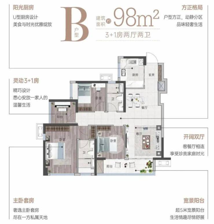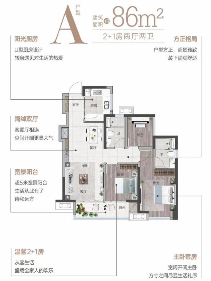85㎡南向三房:这是项目的入门级户型,总价190万起,首付门槛极低,非常适合预算有限的年轻家庭。该户型采用南向布局,保证了充足的日照和通风。5米宽的宽景阳台是最大亮点,不仅拓展了室内外的视觉空间,还提供了晾晒衣物、种植花草、休闲放松的多重功能。主卧套间设计,私密性极佳,提升了居住的舒适度。