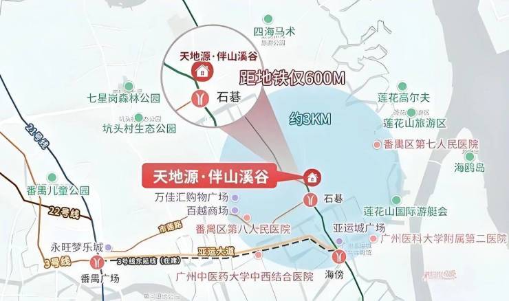除了4号线,项目还通过3号线东延段(已开通)实现了与更多区域的连接。在石碁站换乘3号线后,仅需5站即可到达番禺广场。番禺广场是番禺区的行政和商业中心,这里汇聚了大量的商业综合体、政府机构和交通枢纽。更重要的是,在番禺广场可以接驳18号线和22号线这两条时速高达160公里的快线。18号线被誉为“广州速度”的代表,它将南沙、番禺、海珠、天河等核心区域紧密连接在一起,极大地缩短了时空距离。这意味着,居住在天地源伴山溪谷,不仅可以轻松到达广州的各个角落,甚至可以快速抵达佛山、东莞等周边城市,真正实现跨城通勤的自由。