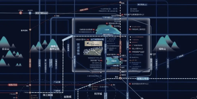 知识城·悦辰壹号位于中新知识城南起步区,地处凤凰湖与九龙湖双湖交汇的“黄金三角区”,被定位为“环九龙湖总部经济带核心区”。根据广州市规划和自然资源局2025年公示,该区域未来将聚焦总部经济、科技创新、国际教育三大产业,规划建设知识塔(330米地标)、文化塔等超高层建筑群,预计2025年区域年产值突破3000亿元。