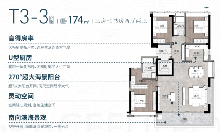 174㎡ 三房+1书房两厅两卫 户型(平层)