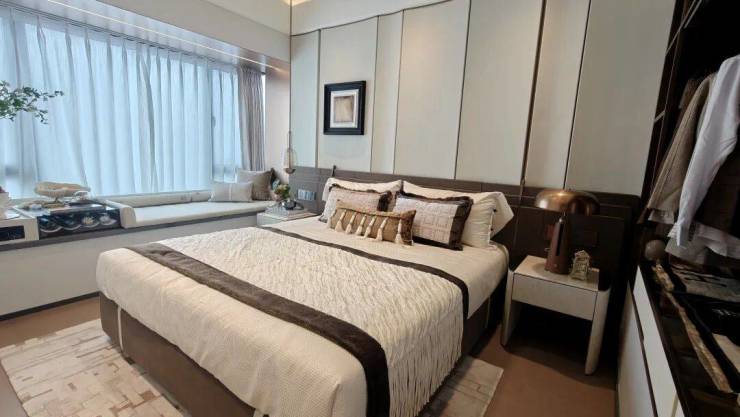 主卧配置了270°环幕景观窗,视野开阔,能欣赏到社区的园林景观,甚至部分楼层能看到河景,让业主在房间里就能享受美丽的风景。而且,主卧采用套房格局,配备独立卫生间和衣帽间,既能保证业主的私密性,又能满足业主的收纳需求,让业主的日常生活更加便捷、舒适。
