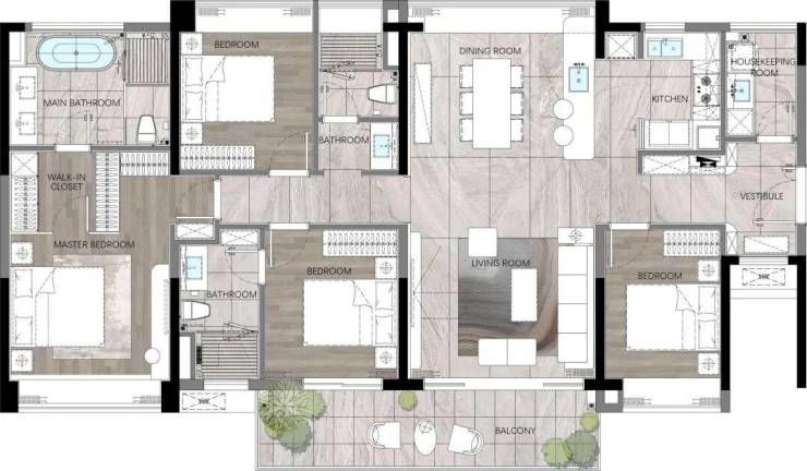 140平方米四室两厅两卫(横向):动静分区明确,主卧套房配置,满足多代同堂的需求;