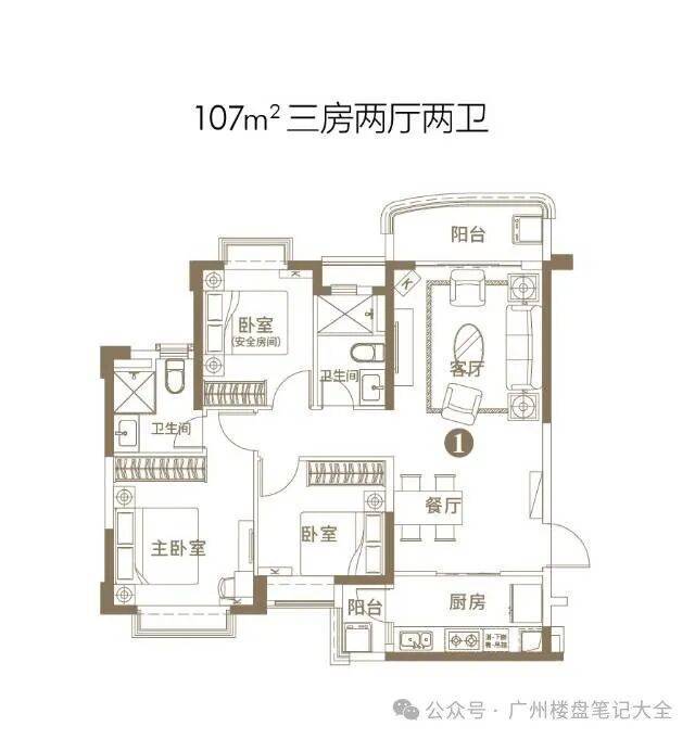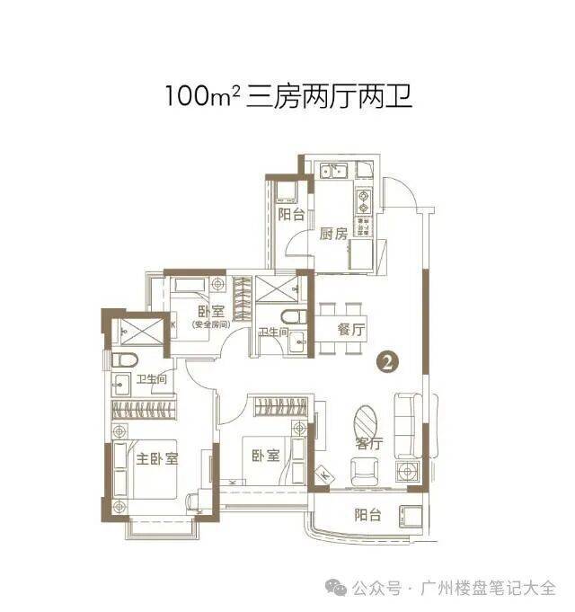 建面约95㎡,三室两厅两卫布局,全明设计、南北对流,三开间朝南,南向面宽达9.6米,采光通风效果极佳。该户型使用率达86%,实际使用面积约82㎡,空间阔绰,适配刚需改善家庭、二胎家庭居住。客厅连接约5.2米宽景阳台,阳台进深1.6米,可打造休闲区、健身区,直面社区园林景观;主卧采用套房设计,面积约16㎡,配备独立卫浴、全景飘窗,保障居住私密性与舒适度;两个次卧空间均匀,面积均在10㎡以上,可灵活改造为儿童房、长辈房;厨房采用U型设计,操作空间充足,动线流畅,配备品牌厨卫设备;两个卫生间均采用干湿分离设计,避免早高峰使用冲突,提升居住舒适度。