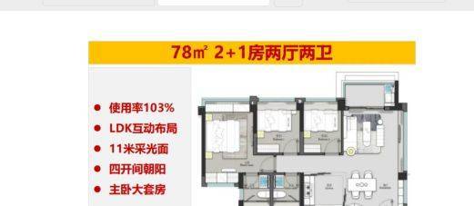 建面约 78㎡三房两卫:四开间朝南,南北通透,客餐厅一体化设计。主卧带独立卫浴,U 型厨房动线合理,兼顾实用性与私密性,非常适配三口之家日常居住。售楼处电话:4009909752 。