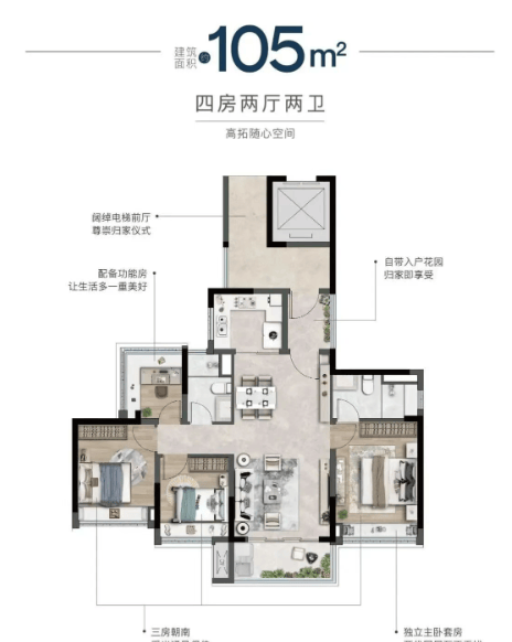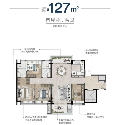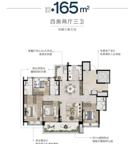 项目主打纯四房改善产品,共三种主力户型:106㎡四房实现四开间朝南,配备入户花园与主卧独立套房;130㎡四房采用U型厨房设计,拥有约6.3米大阳台,南北通透,并设独立书房;168㎡四房三卫则配置双主卧套房、南北双阳台,其中南向阳台长达7米,可尽揽社区园林景观。所有户型均坚持全南向布局,空间方正实用,功能分区合理,充分满足多孩家庭、三代同堂或高阶改善人群对居住品质的极致追求。