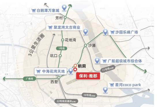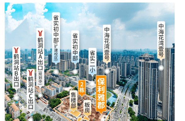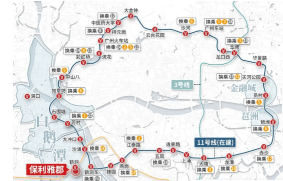 - 交通是保利雅郡的一大优势。虽广钢板块地铁资源丰富,但此前缺少真正的地铁口楼盘,而保利雅郡距离广佛线鹤洞站A口不到100米(A口在建,预计明年9月底竣工),目前从最近的C出口步行至项目仅290米左右,4分钟可达。从鹤洞站出发,10站以内可至陈家祠、农讲所、珠城,乘坐广佛线1站可在沙涌换乘11号线,通车后去往琶洲、金融城、天河北等地更便捷。自驾方面,项目门口是鹤洞路,经鹤洞大桥可快速到达海珠西,周边还有花地大道等干线。无论是地铁还是自驾,50分钟内基本能抵达老荔湾、越秀、珠城等地,交通十分便利。