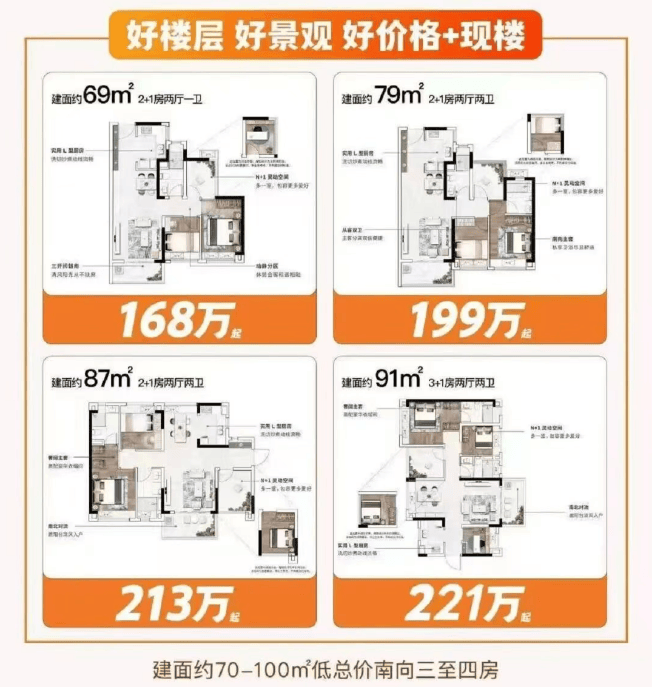 项目提供了多种户型供不同需求的家庭选择,从69平方米的小三房到100平方米的大四房不等,所有户型均采用100%全南向设计,保证了最佳的采光效果和居住体验。