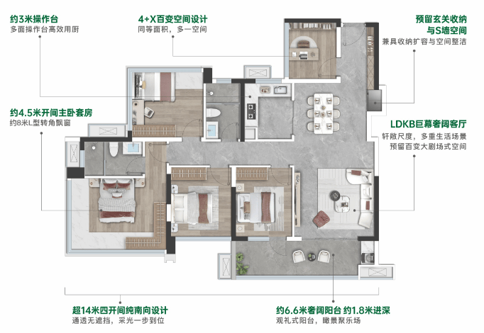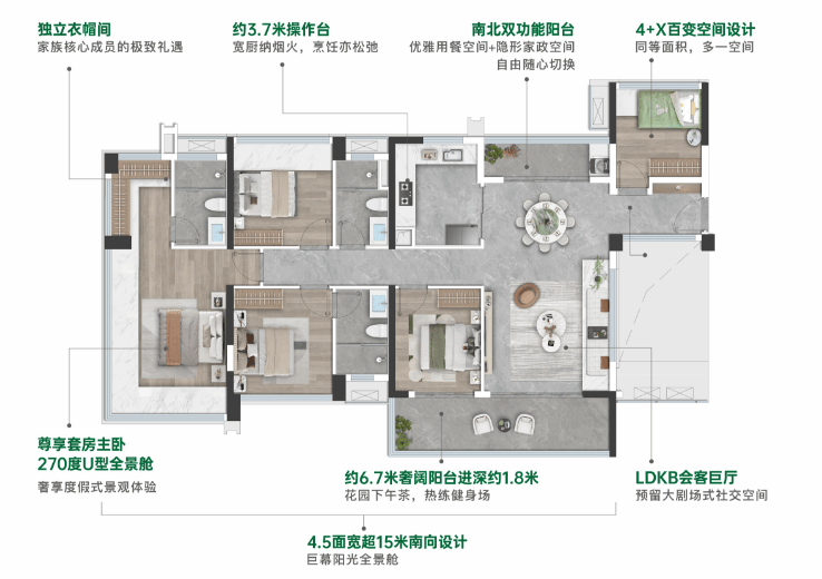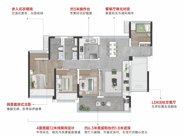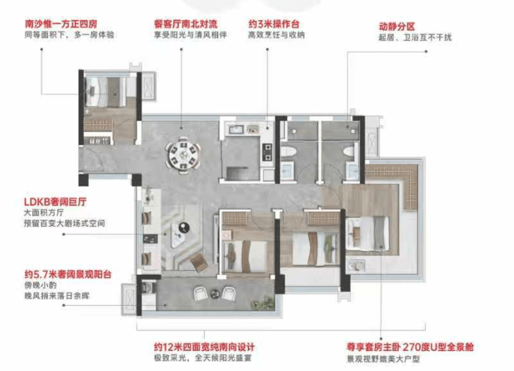 项目户型L型客厅、270°全景窗及超大阳台设计,保证采光和通风,南北通厅布局提升居住舒适度,同时面向森林公园和蕉门河核心景观,景观视野开阔。