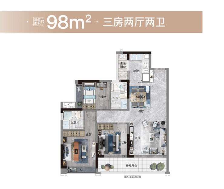 像是98平三房,光是阳台宽度,就达到约6.5米!要知道,广州市场上大部分超过6米的阳台,仅存在于120平以上户型。