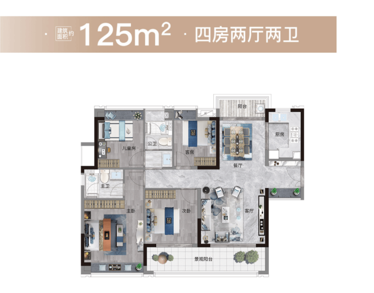 约125平四房设计,整个公区观景面更为夸张,6.7米景观阳台包裹横厅,为屋内带来通透的采光,南北双阳台设计,无论会客或就餐,一抬眼均能看到窗外的江景与园景。