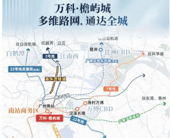 项目距离广州南站约1.5公里,步行稍显不便,但可通过楼巴或公交接驳解决出行问题。周边地铁线路密集,包括2号线、7号线、22号线及佛山2号线,未来随着东晓南路-广州南站连接线和海珠湾隧道的开通,与市区的通勤将更加便捷。