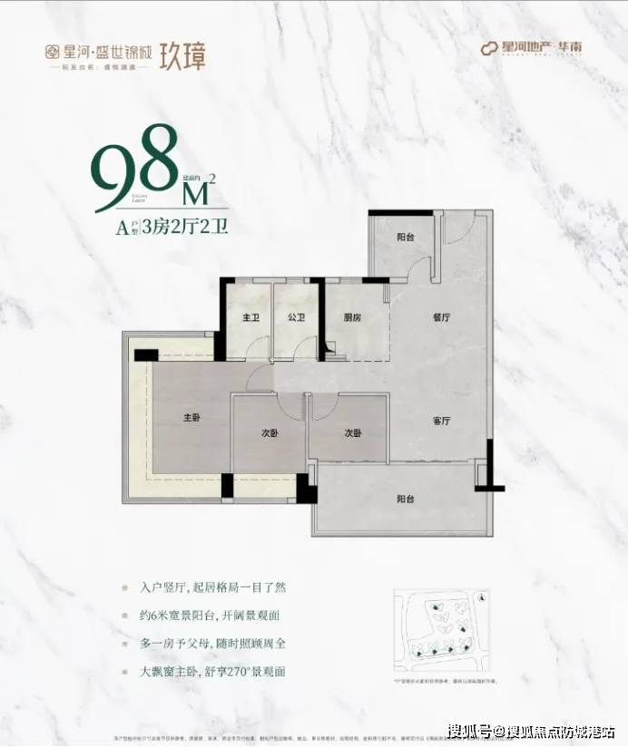 A:主推98㎡三房(总价300万起)、128㎡四房(总价430万起)、135㎡四房(总价480万起),得房率100%,均为南向园景户型。