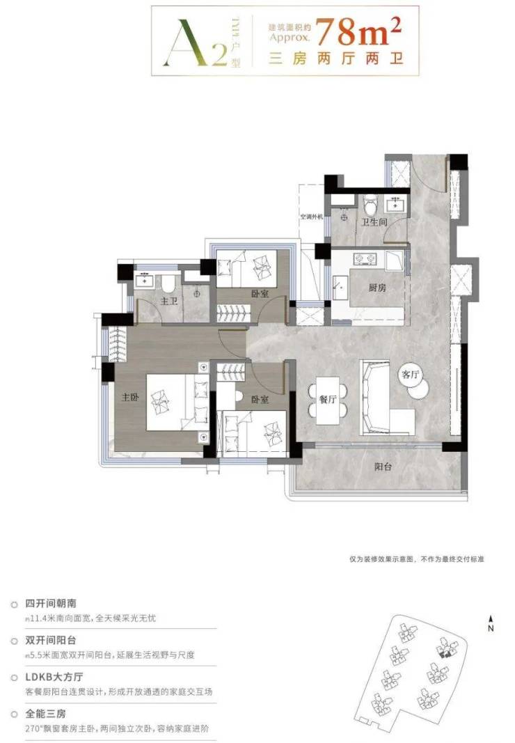 78㎡三房两卫:使用面积约90-95平方米,三开间朝南,客厅+双卧均享充足采光,总价门槛友好,适合刚需家庭。