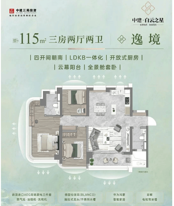 目前项目首开8#地块,主力户型涵盖115㎡三房、128㎡四房、143㎡四房、173㎡双套间及226㎡私梯板式大平层。所有户型均按新规打造,使用率超100%,层高约3.1-3.3米,空间感远超市场平均水平。其中,128㎡户型配备8米弧形阳台,如“空中观景舱”;173㎡实现中西双厨+独立中岛;226㎡则采用两梯两户+私梯入户设计,主卧达36㎡,配1.7米浴缸与美妆冰箱。全屋采用国际一线品牌精装,并搭载华为鸿蒙智能系统,支持跌倒监测、自动关窗等AI功能,科技与舒适兼得。