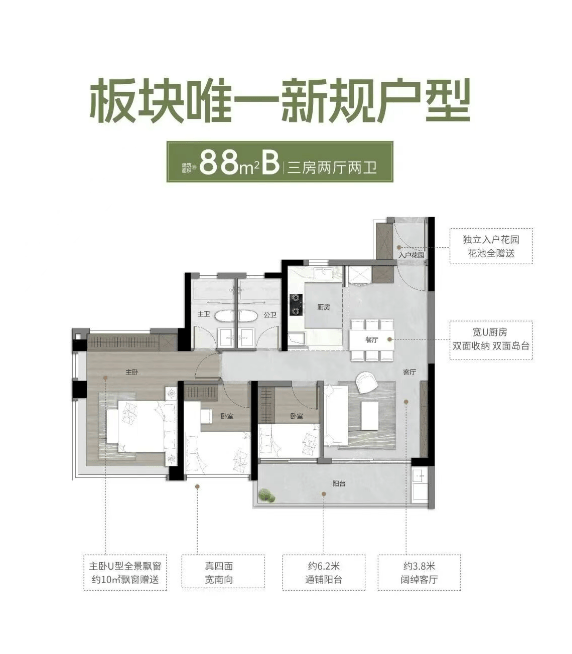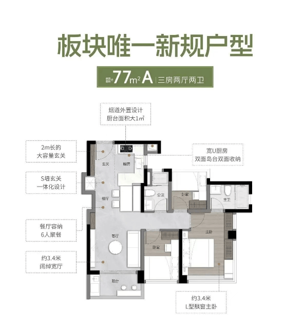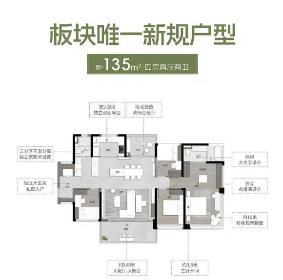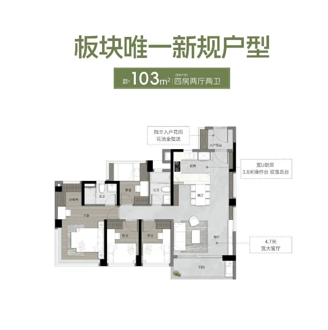 产品力是万科·檐屿城最核心的杀手锏,其户型设计堪称广州“超新规”的教科书。项目主推的77至135平方米户型,通过极致的空间优化,实现了最高约138%的使用率。建面约77平方米的三房两卫户型,做到了三面宽朝南,主卧配备270°全景舱飘窗,LDKB一体化设计让公共空间通透大气;建面约88平方米户型提供了多种变异方案,有的拥有可变双开间宽阳台,有的主卧赠送步入式衣帽间,7.3米通铺阳台连接次卧,视野开阔;建面约103至105平方米的四房户型,带有独立入户花园,客厅面宽约5米,主卧L型超7米转角飘窗将景观引入室内;而建面约135平方米的终极改善户型,南北通透双阳台,主卧开间达3.6米,堪比紧凑三房的客厅尺度。在装修标准上,项目不惜成本选用雀眼木木饰面、东方既白岩板、8mm超白玻璃等珍稀材料,全屋隐藏式中央空调、方太厨电三件套及智能马桶成为标配,120处魔鬼精工细节更是将品质感拉满。