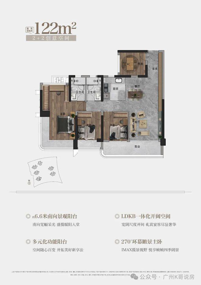122㎡户型,约6.6M南向景观阳台 | 270°环幕瞰景主卧|多元化功能阳台