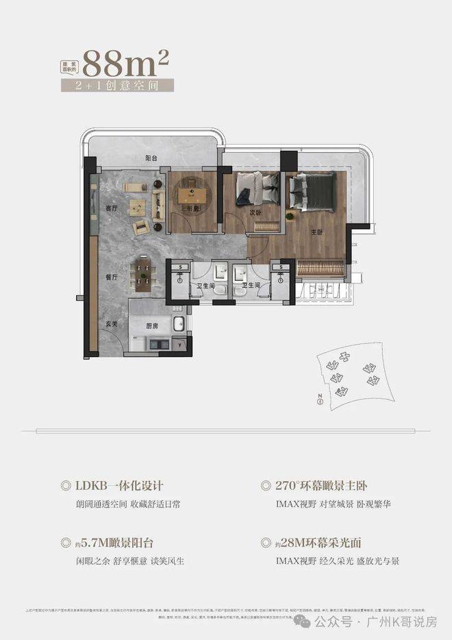 105㎡户型,约6.1M巨幕阳台 | 270°环幕瞰景主卧|LDKB一体化设计