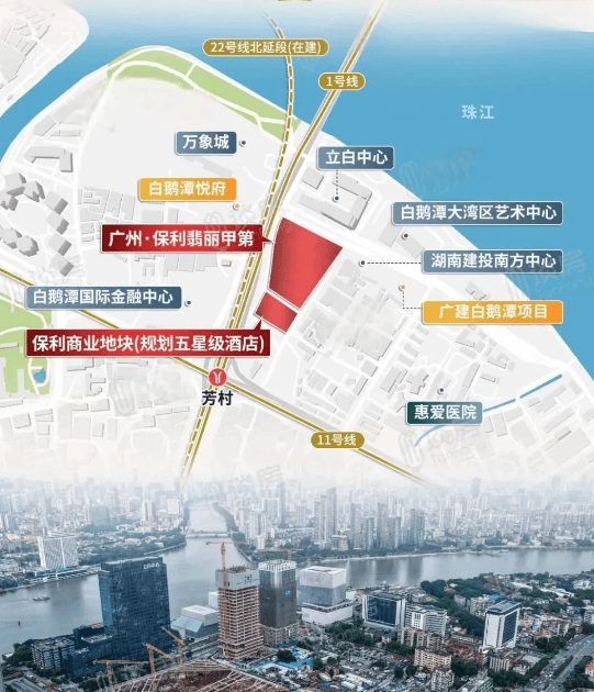 项目配套兼顾当下实用性与未来发展潜力。教育方面,自身配建 1 所 9 班幼儿园,可满足业主子女学龄前教育需求;周边五眼桥小学、君诚博雅实验学校等已挂牌康有为纪念学校,虽目前生源结构暂未调整,但基础教育资源稳定,未来随白鹅潭板块升级,教育配套有望进一步优化。商业方面,除依托芳村大道沿线成熟街铺满足日常消费外,3 公里范围内可享白鹅潭万象城(预计 2026 年中开业)、聚龙湾太古里(2025 年底首开区启幕)等世界级商业配套,高端购物、餐饮、娱乐需求一站式满足。医疗方面,步行约 800 米可达广州中医药大学第三附属医院(芳村分院),3 公里内还有广东省中医院芳村分院、广医二院等三甲医院,为家人健康提供坚实保障。