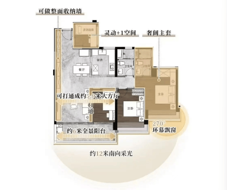 项目主推建面约 107㎡、128㎡、143㎡、181㎡纯改善四房,实用率 110%-120%,为广州主城同面积段天花板,具体解析如下: