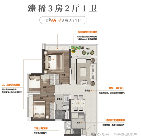 69㎡三房一卫:紧凑而不局促,U型厨房+阔景阳台+双飘窗设计,小户型也能拥有大视野;