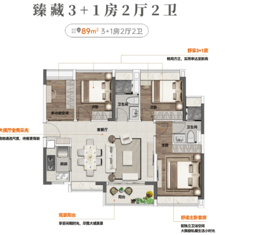 85㎡/89㎡四房两卫:格局方正、南北通透,三代同堂亦能各得其所;