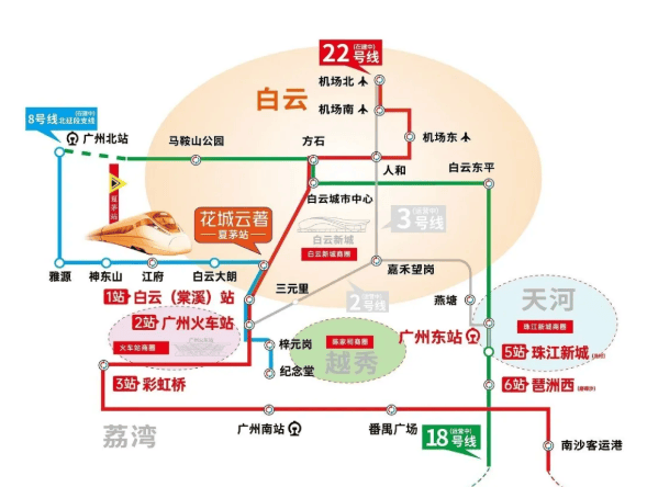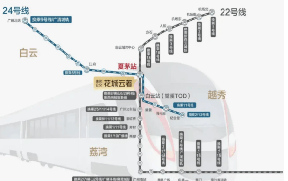 花城云著最大的亮点之一,便是其无可比拟的交通优势。项目正对在建的夏茅地铁站,步行仅约50米,真正实现“地铁就在家门口”。该站未来将汇聚8号线北延段、22号线北延段及规划中的24号线三条轨道线路,成为白云区重要的交通枢纽。