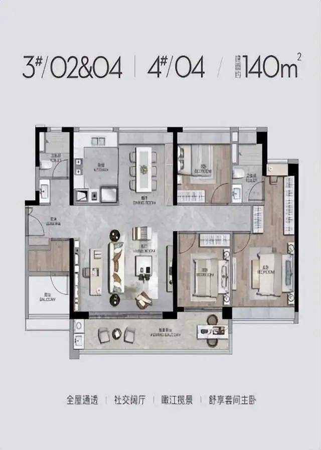 🌟 135-140㎡四房(高端改善):横沥岛稀缺的四房户型,南北通透,双阳台设计(生活阳台 + 观景阳台),部分户型享一线江景。空间开阔,私密性强,配备独立书房与社交会客区,适配高阶家庭的居住与社交需求,是板块内高端改善的首选。