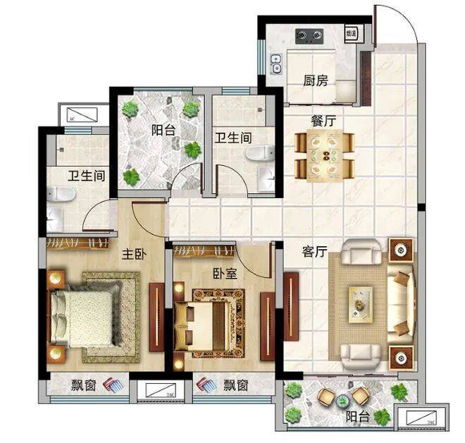 94平方米户型(三房两厅两卫,正南朝向):