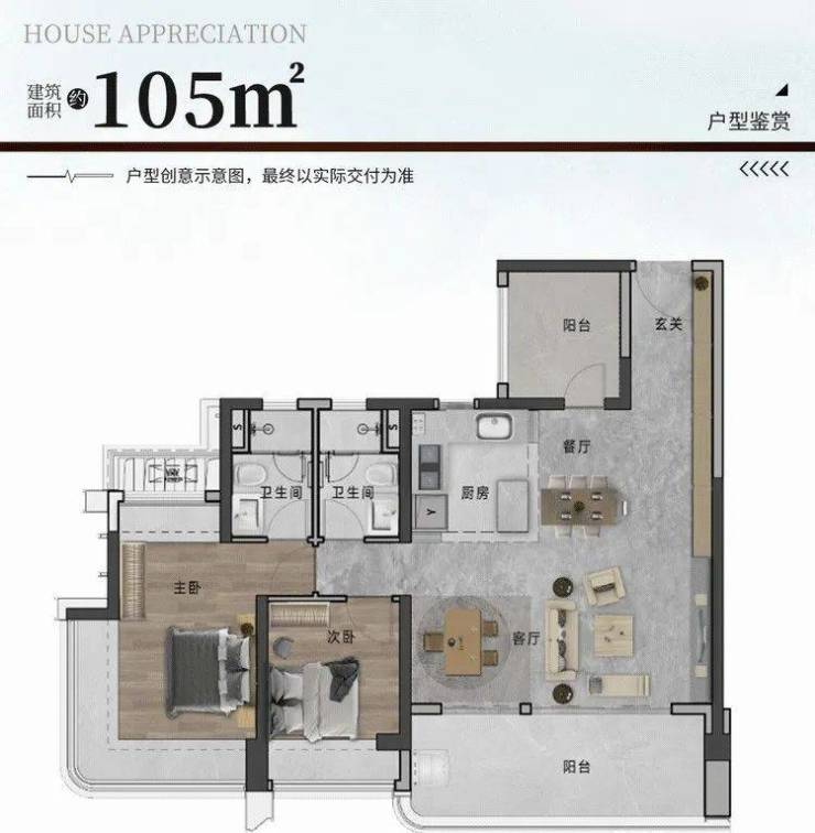 建面105㎡四房,LDKB一体化,竖厅设计,约6.1米宽景阳台连通次卧。