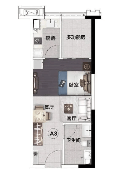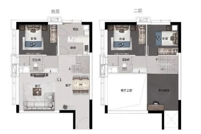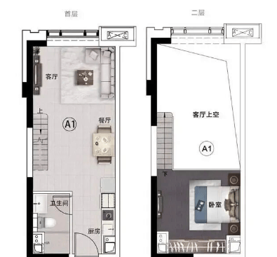 百变loft产品 | 49.72㎡一室二厅一卫:小户型大空间,挑高设计带来开阔视野。