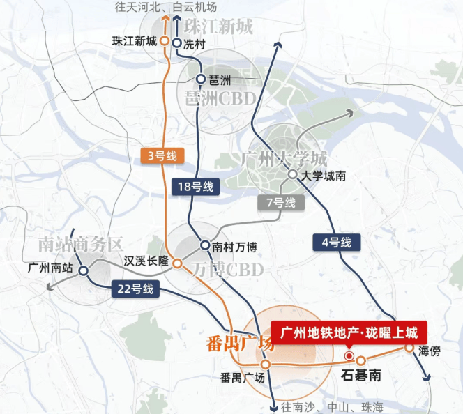 A:项目距地铁3号线石碁南站仅500米,2站直达番禺广场,无缝对接18/22号线,实现3站到万博CBD、4站到广州南站和琶洲CBD、5站到珠江新城,半小时通达市中心,一小时畅行大湾区。